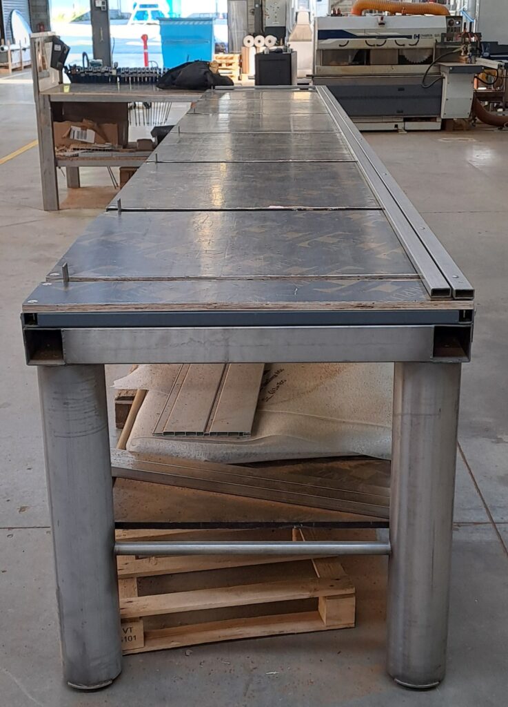 Une table réalisée sur-mesure, qui répond aux besoins spécifiques de ces produits. En effet, son ergonomie permet d’assembler parfaitement les caillebotis ainsi que les habillages latéraux.